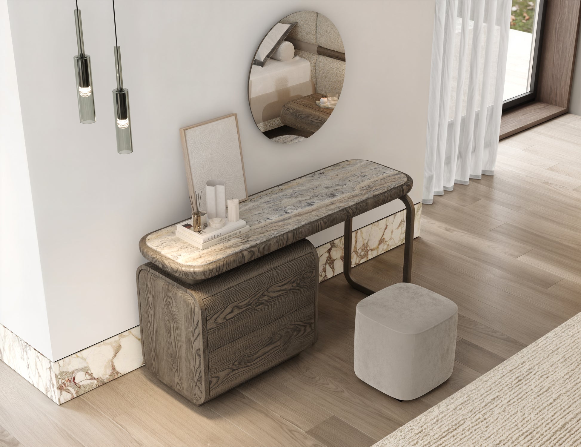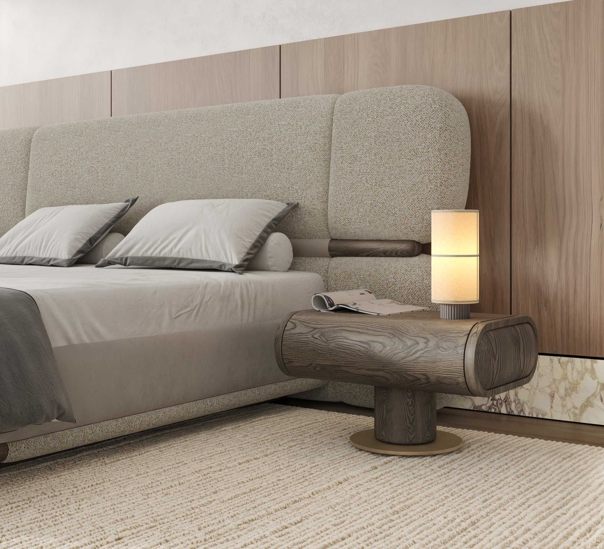 A bed that commands the room. The sculpted headboard in textured fabric plays against warm wooden panels, creating depth and balance. Minimal yet striking, it turns your bedroom into a space that feels curated, not cluttered.