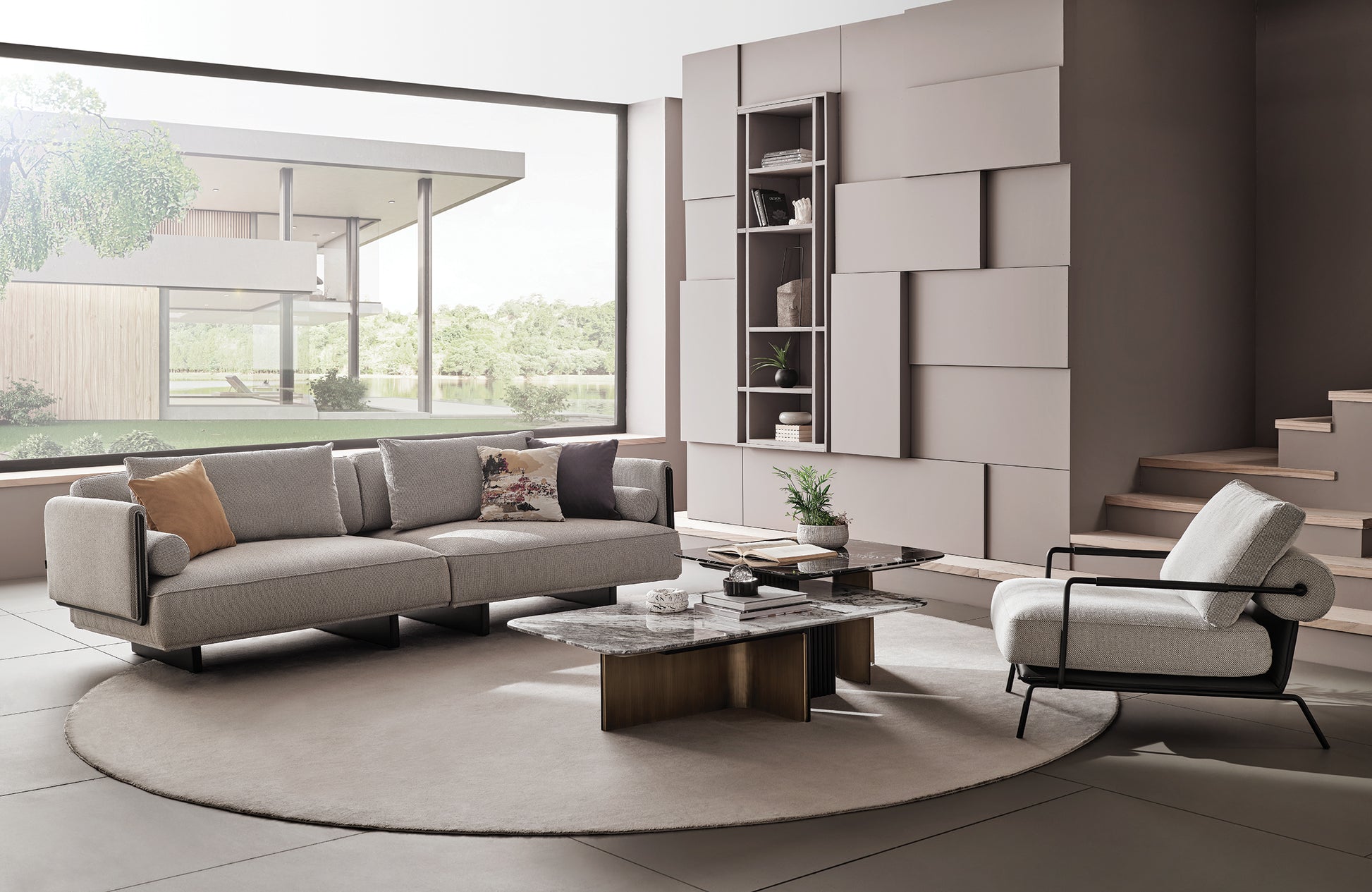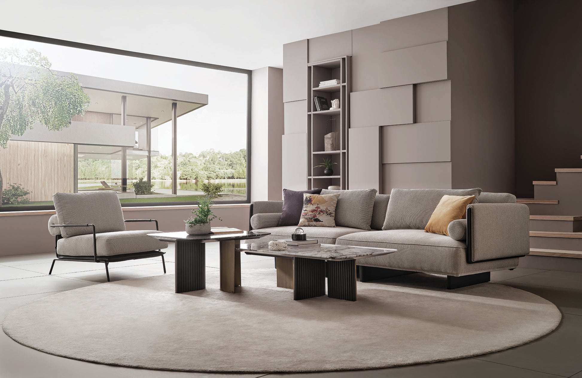 Upholstered in a premium heavy-weave grey fabric, the Canton offers a tactile richness that feels grounded and substantial. The deep seating and plush, loose back cushions invite you to sink in, while the low-profile block base keeps the look sleek and decidedly contemporary. It is a piece that commands attention without demanding it—effortlessly cool, structurally fascinating, and undeniably comfortable.
