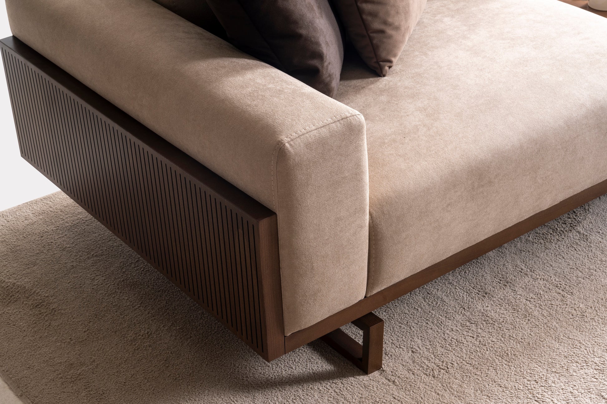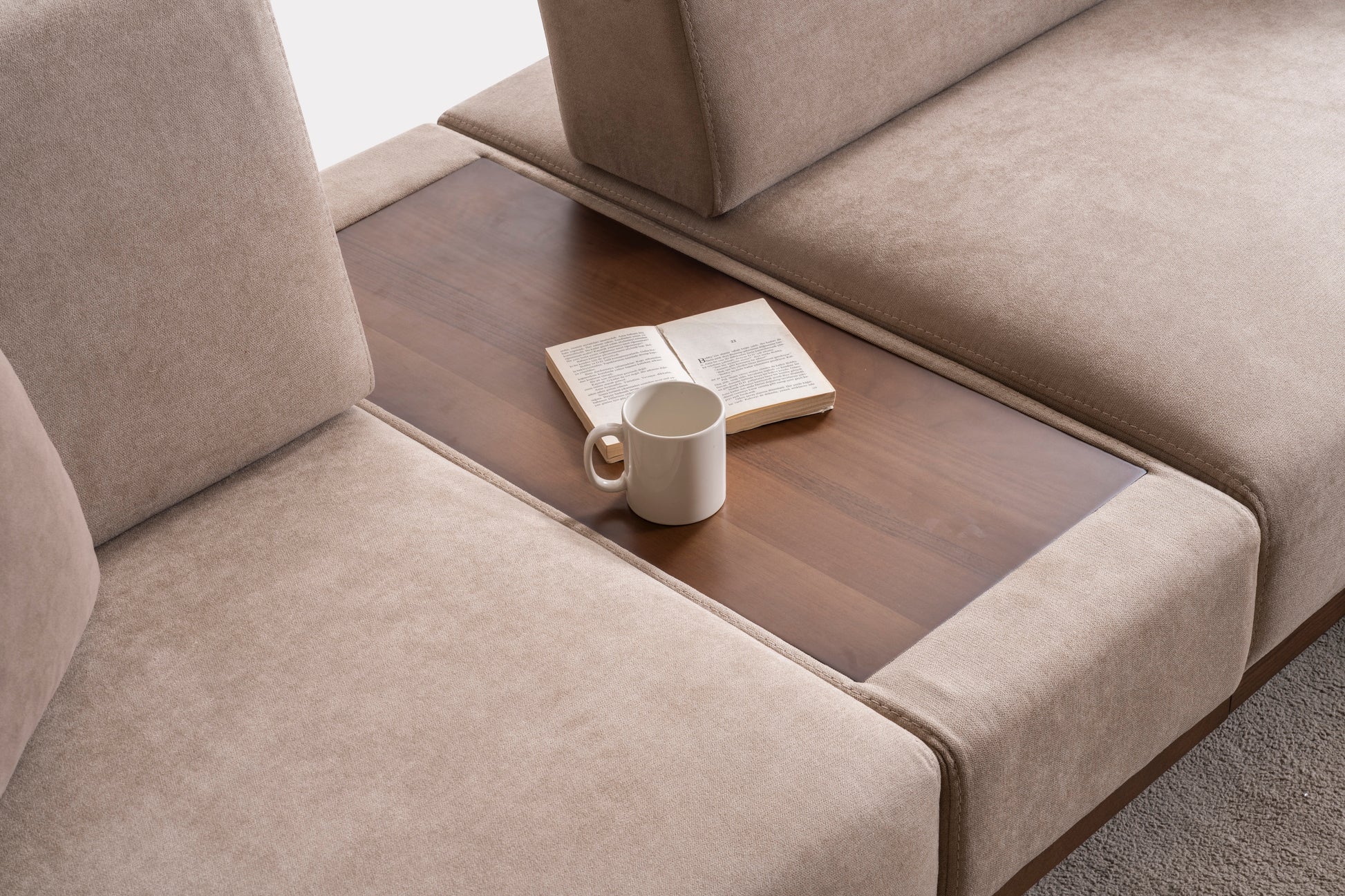 Its signature wood-clad edges bring structure and sophistication, while the reclinable seats invite relaxation that adapts to you. The central wooden table seamlessly merges function with form, creating a living space that feels grounded, elegant, and effortlessly composed.