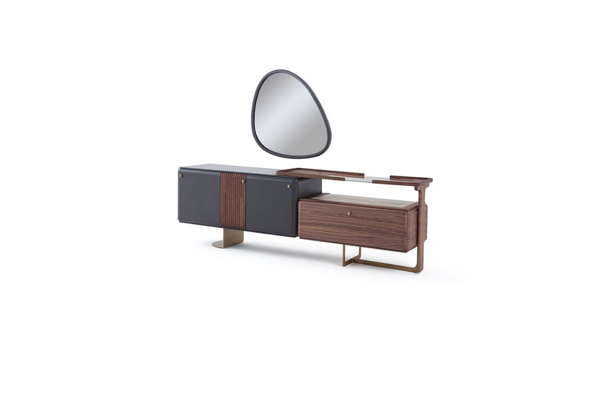 The console with storage is a stylish and functional piece that brings a unique touch to any living space. Its dual combination of grey color with wood creates a contemporary and sophisticated look. The grey color adds a modern flair, while the wood accents bring warmth and natural beauty to the design. The console features a unique feature on top, adding visual interest and making it a focal point in the room. The metal knobs and legs add a sleek and industrial touch, enhancing the overall aesthetic appeal. Not only does this console offer a visually pleasing design, but it also provides ample storage space. With its storage compartments and drawers, you can easily keep your belongings organized and out of sight. Whether you need to store books, electronics, or other items, this console offers the perfect solution. The combination of style, functionality, and unique features makes this console a versatile addition to any home. It can be placed in an entryway, living room, or even a bedroom, adding both storage and visual appeal. The console with storage is a perfect choice for those who appreciate modern design and value practicality.